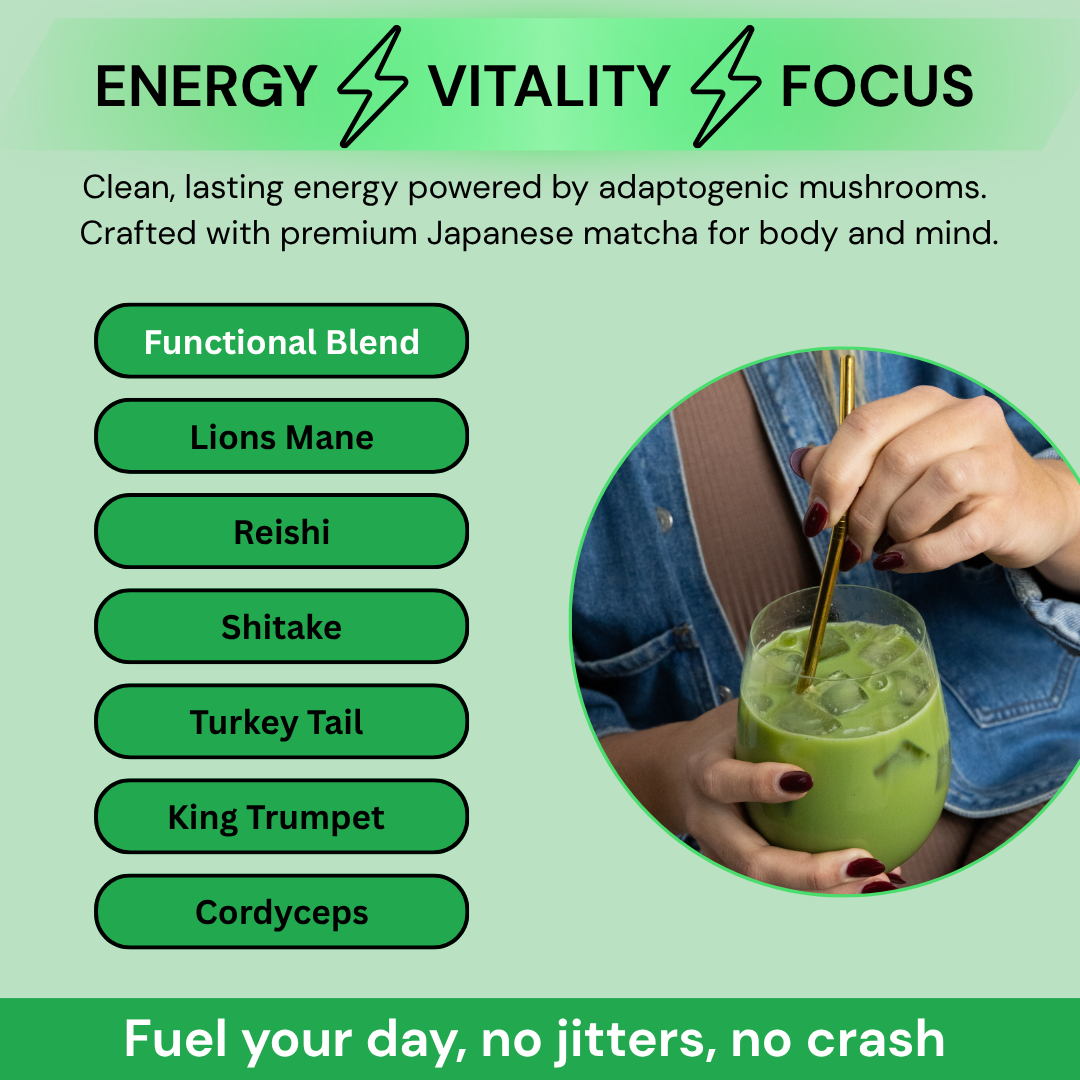 Yes, it delivers a smooth, sustained energy boost without the jitters or crashes, thanks to the combination of matcha and adaptogenic mushrooms.