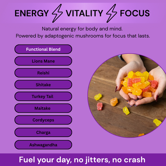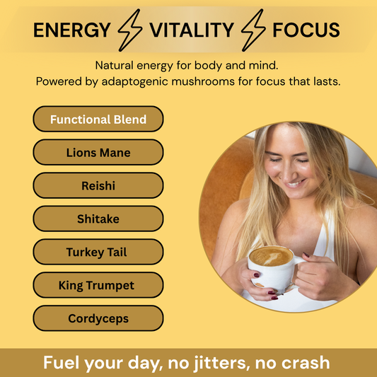 Functional mushrooms contain bioactive compounds — including beta-glucans, terpenes, antioxidants and polysaccharides — that have been researched for their effects on brain function, stress response, immune balance, and cellular health.